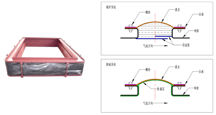 适用部位:吸收塔出入口、原烟道、净烟道、湿式电除尘出入口、混凝土烟囱脱硫非金属膨胀节